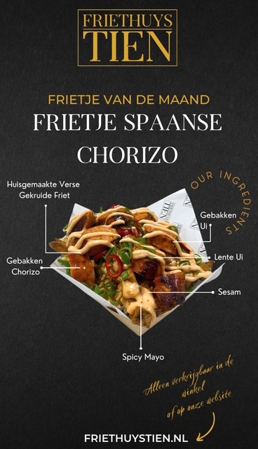 Huisgemaakte gekruide friet, gebakken chorizo, spicy mayonaise en afgegarneerd met sesam, gebakken uitjes en lente ui